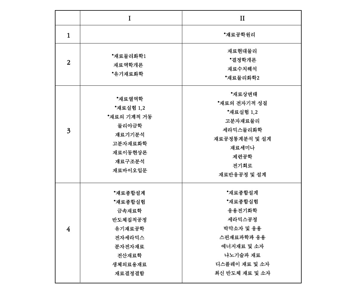 표 1. 서울대학교 재료공학부 학사과정 전공과목 이수표준형태 (*는 전공필수과목)
