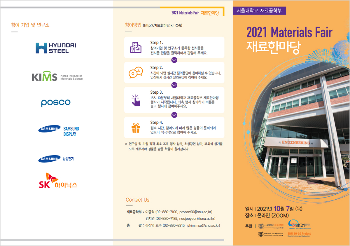 재료공학부만의 특별한 행사로는 매년 열리는 <재료한마당>이 있어요. 재료한마당은 연구실 투어 및 기업 채용 박람회가 결합된 행사라고 할 수 있는데요, 재료공학부 연구실마다 소개 부스를 운영하고, 삼성전자, SK하이닉스 등 여러 기업체에서 채용 상담 부스를 운영합니다. 또한 연구실과 기업체에서 인턴 활동을 우수하게 수행한 학생들이 직접 인턴 내용과 소감, 조언을 발표하는 자리도 마련 되어있고, 학부생 연구실 인턴 및 대학원생들의 연구 결과 포스터 발표도 같이 진행되어 앞으로의 학업 계획과 진로 설계에 대한 도움도 받을 수 있습니다. 아주 유익한 행사죠? 또 격년에 한 번 교외교육 행사가 있는데, 이 행사에서는 기업체를 직접 탐방해볼 수 있고, 선후배 간의 만남이 이루어지기도 합니다.
