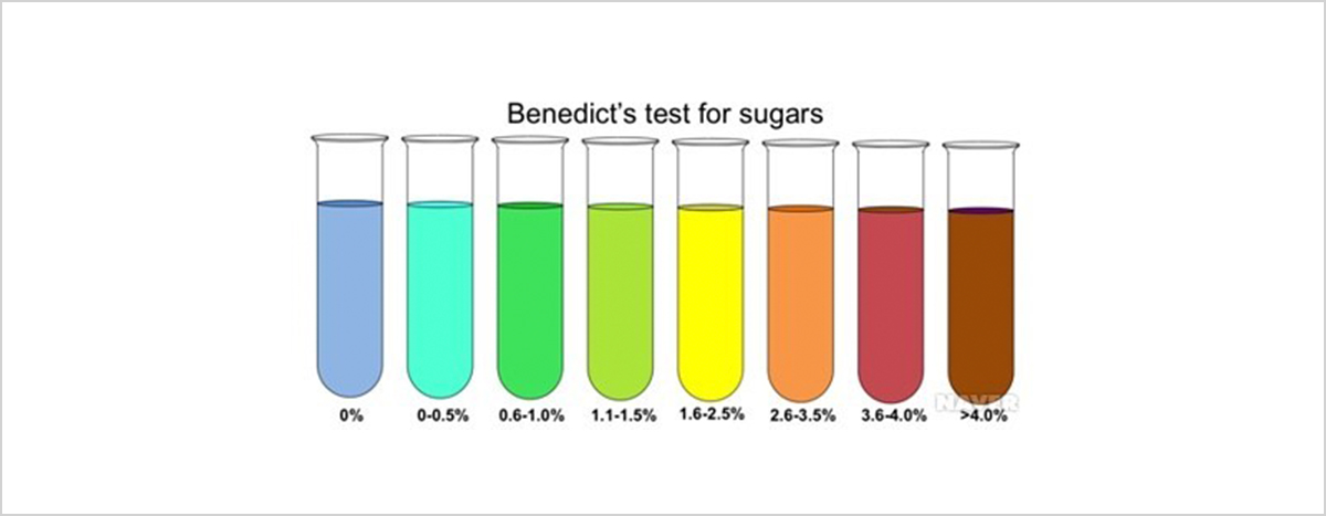 포도당이 포함된 용액에 베네딕트 용액을 섞으면 당의 농도에 따라 적갈색에서 황록색 사이의 색이 나타납니다.