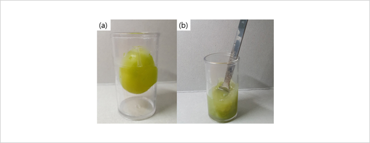 200ml 비커에 정수기 온수를 담아 20ml 비커를 넣고 5분간 중탕한 결과, [그림 7b]처럼 용액이 노란색으로 변한 것을 관찰할 수 있었습니다.