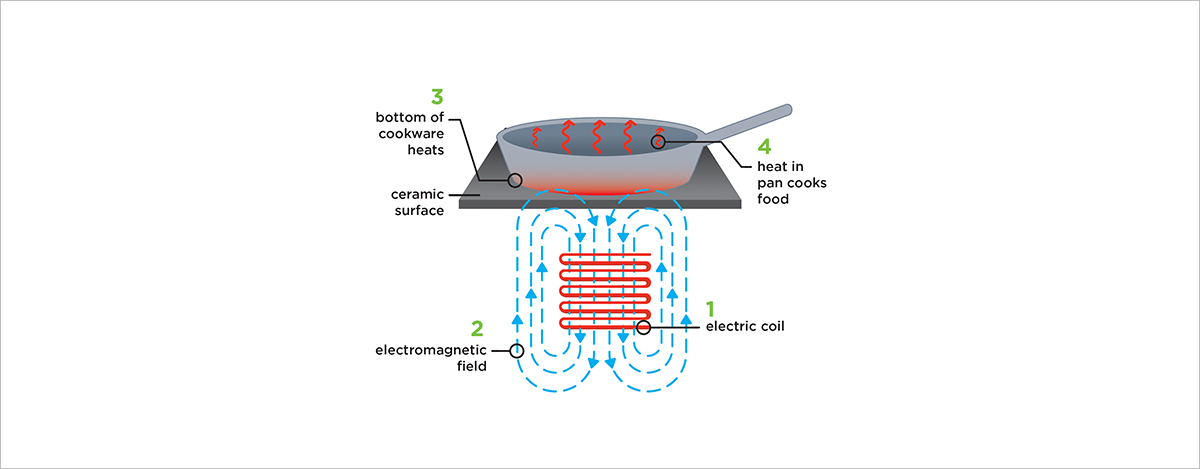 이후 3번, 프라이팬 혹은 냄비의 바닥(bottom of cookware)에 맴돌이 전류가 생겨 열 에너지가 발생하고, 이는 4번의 결과, 즉 음식을 달구는 것으로 이어집니다.