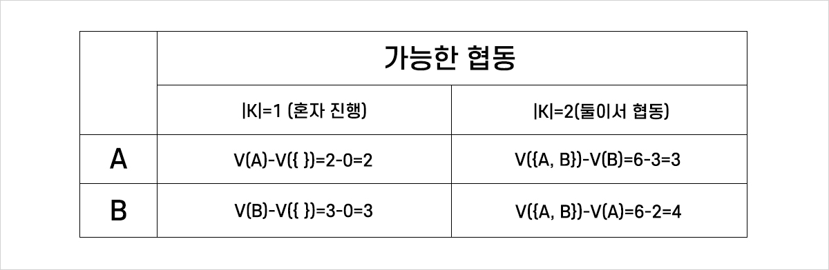 그렇다면 이제 가능한 협동에 따른 추가적 기여를 계산해 봅시다. A와 B가 프로젝트를 진행하는 내내 같이 하지는 않겠죠? 어느 때는 각자 일을 할 때도 있고, 어느 날은 협동하는 경우도 있을 겁니다. 먼저 A의 경우 혼자 일을 진행하였을 때의 추가적 기여는 V(A)-V({ })=2-0=2가 됩니다.2 또한 A와 B가 일을 같이 진행한 경우 A의 추가적 기여는 V({A, B})-V(B)=6-3=3 이 됩니다. B의 경우를 살펴볼까요? 먼저 B가 혼자 일을 진행한 경우 추가적 기여는 V(B)-V( )=3-0=3, A와 B가 같이 일을 진행한 경우 B의 추가적 기여는 V({A, B})-V(A)=6-2=4가 됩니다. 표로 정리하면 협동하는 인원의 개수를 의미하는 변수인 |K|(K의 크기)에 따라 다음과 같이 나올 수 있겠네요.