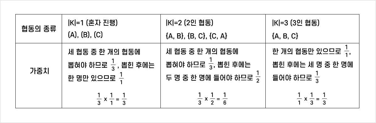 또한 둘이서 협동한 경우(|K|=2), 가능한 협동의 개수는 A와 B가 모두 진행하는 경우 한가지입니다({A, B}). 여기서 A의 가중치를 계산해 주면 우선 한 가지 상황만 가능하므로 $\frac{1}{1}$, 협동에 속해 있는 A, B 두 명 중 A가 뽑혀야 하므로 $\frac{1}{2}$을 곱하여 가중치는 $\frac{1}{1}$× $\frac{1}{2}$= $\frac{1}{2}$이 됩니다. B의 경우도 마찬가지로 $\frac{1}{2}$이 되겠네요.