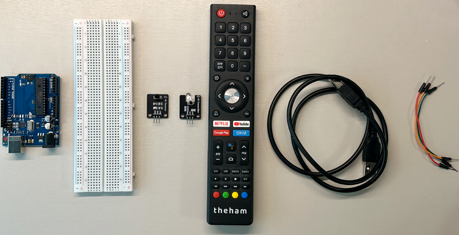 이제 아두이노를 이용하여 리모컨을 만들어 볼 건데요, 필요한 부품은 다음과 같습니다. 왼쪽부터 아두이노 우노(UNO) 보드, 브레드 보드3), 적외선 수신 모듈, 적외선 송신 모듈, 복제하고자 하는 리모컨, 데이터 케이블, 점퍼 와이어(M-M)입니다.