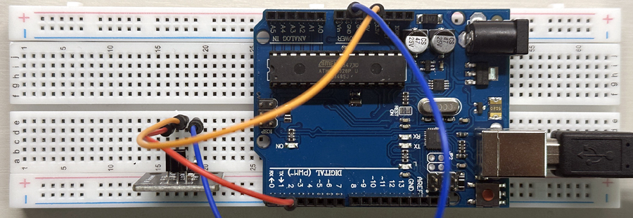 이를 알아내기 위해 다음 사진과 같이 브레드 보드에 적외선 수신 모듈을 연결한 후, 전선을 이용하여 브레드 보드와 아두이노 보드를 연결했습니다. 이때 적외선 수신 모듈의 VCC핀을 아두이노 보드의 5V 핀에, 모듈의 GND핀을 보드의 GND핀에, 모듈의 DATA핀을 보드의 2번 핀에 연결해야 합니다.