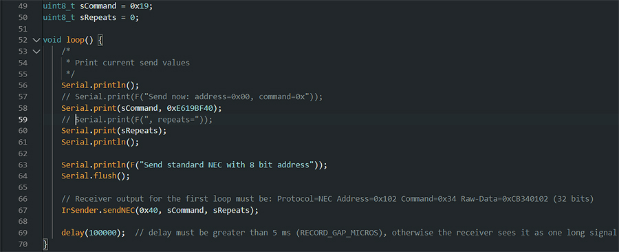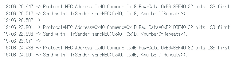 또한, 'Address=0x40'는 장치를 식별하는 데 사용되는 값이고, 'Command=0x19'는 해당 버튼의 기능을 나타내는 명령 값입니다. 마지막으로, 'Send with: IrSender.sendNEC(0x40, 0x19,