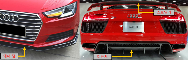 이를 예방하기 위해 레이싱 차량에는 스포일러, 에어 댐, 디퓨저 등 부품이 부착됩니다. 스포일러는 차체 후면에 거꾸로 붙은 날개로, 비행기의 날개와는 다르게 지면 방향으로 양력을 만듭니다. 에어 댐과 디퓨저는 차체 하부의 압력을 낮추는 역할을 하는데요. 에어 댐은 공기의 유입을 차단하고, 디퓨저는 하부의 공간을 좁아졌다 확 넓어지게 하여 좁은 영역의 공기 흐름을 가속하고 이 부분을 저압으로 만들어 다운 포스를 형성하죠. 여기서 차체 하부의 기울기를 뜻하는 '레이크'를 달리하여 디퓨징 성능을 조절할 수도 있습니다.