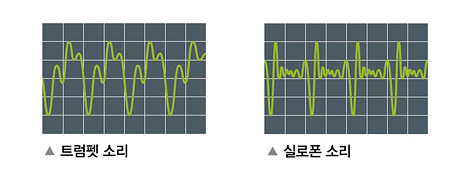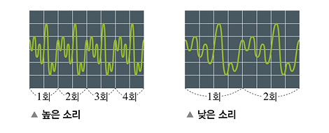 또한 주파수가 높으면 고음, 주파수가 낮으면 저음이 됩니다. 주파수란, 단위 시간당 진동이 몇 번 일어나는지를 나타내는 개념입니다. 주파수가 2배가 되면 음정은 한 옥타브 높아진다고 합니다. 위의 그림에서 높은 소리는 낮은 소리에 비해 한 옥타브 높은 소리를 내겠네요.