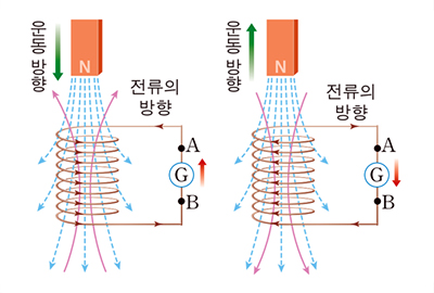 전자기 유도 법칙이란, 도선을 통과하는 자기장이 변화할 때 도선에 전류가 유도된다는 법칙입니다. 각 점에서 자기력의 방향을 나타내는 자기력선은 N극에서 나와 S극으로 들어가는데, 도선을 통과하는 자기력선이 증가할 때와, 감소할 때 도선에는 다른 방향의 전류가 유도됩니다 코일 근처에서 자석을 움직이면, 코일에는 자석의 운동을 방해하는 방향으로 전류가 유도되는데, 이를 렌츠의 법칙이라고 합니다. 코일의 감은 방향이 반대이면, 같은 자기력선의 변화에 대해 다른 방향으로 흐르는 전류가 유도됩니다. 위 그림에서는 코일의 감은 방향이 달라지면 A에서 B로 흐르던 전류가 B에서 A로 흐르게 되는 것이에요.