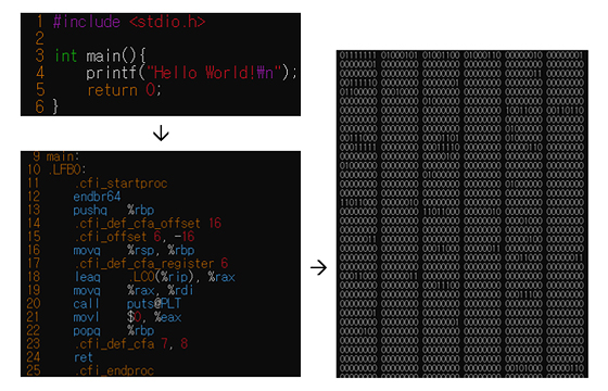 컴퓨터가 0과 1의 이진수로 정보를 저장하고 처리한다는 것은 이제 너무나 잘 알려진 사실입니다. [그림1]처럼 프로그래머가 0과 1로만 대화하는 인터넷 밈도 있죠. 하지만 고등학교 정보 과목이나 코딩 학원 수업에서 0과 1로만 무언가 해 본 독자님은 없을 것입니다. 알파벳과 기호로 C언어, 파이썬 등의 코드를 짜거나, 심지어 스크래치나 엔트리 같은 학습 툴에서는 코드도 없이 블록을 조립해 프로그래밍을 하죠. 이렇게 할 수 있는 건 인간이 알아보기 쉬운 '고급 언어'의 코드와, 이진수로 된 컴퓨터 내부 '저급 언어'를 서로 변환하는 시스템이 있기 때문입니다.1) 이를 명령어 집합체(Instruction Set Architecture), 줄여서 ISA라 부릅니다.