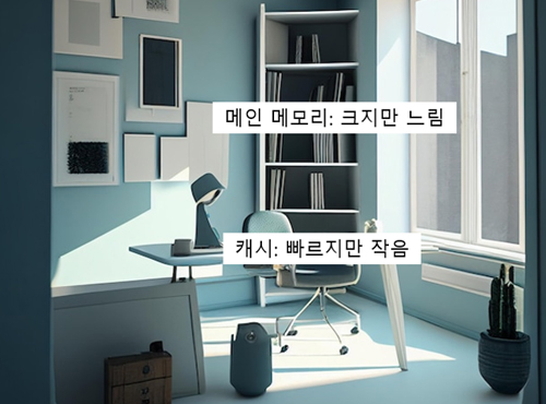 거실의 책장에 책이 많이 꽂혀 있고, 방에서 책으로 공부하는 상황에 비유해 보겠습니다. 모든 책을 책장에 보관한다면 다른 책을 참고하고 싶을 때마다 거실을 오가야 합니다. 이때 책상에 자주 보는 책 두세 권을 꽂아 두면 방과 거실을 오가는 시간을 줄일 수 있겠죠. 대신 찾는 책이 있을 때 책상을 우선으로 확인하거나, 거실의 다른 사람이 내 책상에 있는 책을 찾으면 서로 소통하는 등 추가적으로 신경 써야 할 점들도 생길 것입니다. 컴퓨터 구조 수업에서는 이처럼 캐시를 사용하여 생기는 이점과 추가적 노력을 배웁니다.