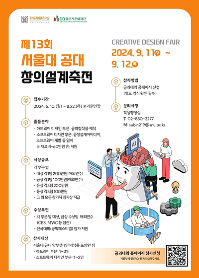 매년 서울대학교 공과대학에서 여는 창의설계축전은 학생들의 공학 창작물을 겨루는 대회로, 2012년 처음 개최된 후 제13회까지 그 명맥을 이어오고 있습니다. 서울공대는 창의설계축전을 통해 학생들이 전공 서적과 도서관에서 빠져나와 자신의 아이디어를 현실에 구현하는 실전적 경험을 쌓을 기회를 제공합니다.