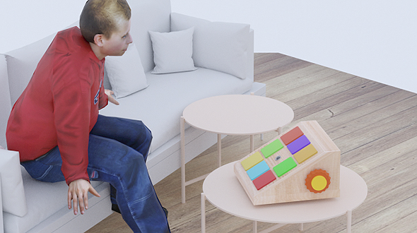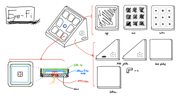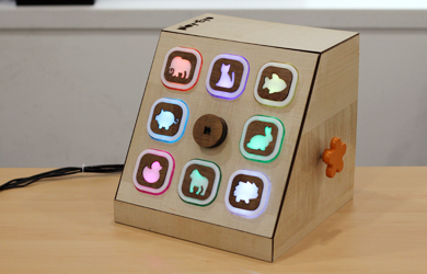 EyeFi는 3×3 패드 형태의 장난감입니다. 장난감을 작동시키면 각 패드에 불이 들어오는데 해당 방향으로 시선을 돌리면 불이 꺼지면서 다음 패드에 불이 들어오는 구조입니다. 패드 중앙에 설치된 카메라와 장치 내부의 소형 컴퓨터가 영유아의 시선을 추적하는 방식으로 이를 구현하였습니다. 또한 각 단계를 넘어갈 때마다 녹음된 동물 소리를 재생하여 영유아의 흥미를 유발하였으며, 소재로 목재를 선정하고 제품 형태를 둥글게 만들어 안전성을 높였습니다.