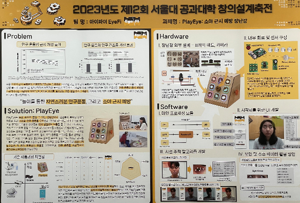 공학은 세상을 이롭게 하는 기술을 만들어내는 학문이라고 하지 않던가요? 그래서 저희 팀에서 아이디어를 낼 때에도 당시 사회가 직면한 현안들에 닿아 있는 아이템으로 선정하려고 했습니다. 3시간의 검색과 회의 끝에 스마트 디바이스의 보급으로 빠르게 늘고 있는 '영유아 근시'를 아이템으로 잡게 되었습니다. 나중에 무려 애플이 그해 겨울 근시 예방 기능(눈과 화면이 너무 가까우면 안내를 해주는 기능)을 업데이트하는 것을 보고 저희의 주제 선정이 탁월했다는 생각을 하기도 하였습니다.