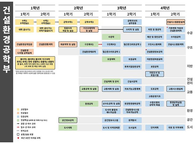 '그림3' 로드맵에서 음영 부분에 들어 있는 전공 과목들을 통해 학부의 8가지 세부 분야를 자세하게 학습하게 됩니다. 특히 분야별로 실험과 실습을 진행하는 과목들이 있어, 배운 전공 지식이 실제 사회 기반 인프라를 꾸리는 데 어떻게 접목되는지 몸소 배울 수 있죠.
