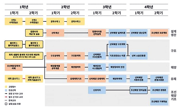 조선해양공학과에서 제시하는 학과 전공 로드맵은 아래와 같아요. 음영 부분에 해당하는 전공 수업들을 통해 앞서 살펴본 조선공학과 해양공학의 각 분야 전반에 대해 배우게 됩니다.