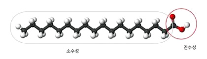 그렇다면 왜 물로는 공중에 떠다니는 방울을 만들 수 없는 걸까요? 그 이유는 방금 설명했던 표면장력의 차이에 있습니다. 물은 강한 극성을 가져 분자 간 인력이 매우 큽니다. 따라서 내부 분자들도 서로를 강하게 당기고, 얇게 펴지지 않고 작은 방울 같은 형태를 가집니다. 그런데 여기에 비눗물의 성분인 계면활성제를 넣어 주면 표면장력이 약해져 얇게 펴진 구 형태를 가질 수 있습니다. 계면활성제는 세제나 비누의 성분으로, 친수성기와 소수성기로 나누어져 있습니다.