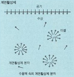 소수성기는 기름 같은 비극성 물질과 친화성을 갖고, 친수성기는 물과 같은 극성 물질과 친화성을 갖습니다. 이 계면활성제가 물에 용해되면 친수성 부분은 물에 있고 소수성 부분은 공기에 있도록 표면으로 배향됩니다. 이 과정에서 표면의 물 분자의 일부가 계면활성제 분자로 대체되고 계면활성제와 물 사이의 분자 간 인력이 두 물 분자 사이의 분자 간 인력보다 작기에 표면장력이 감소합니다.
