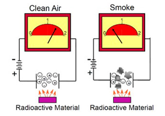 이온화식 화재경보기 안에는 양전하와 음전하를 띠는 판이 있고, 그 사이에 방사성 동위 원소1)가 있습니다. 방사성 물질이 방출하는 알파 입자2)가 공기 분자를 이온화해서 양전하와 음전하를 갖는 이온을 생성하는데요, 그 이온들에 의해 전류가 흐르게 됩니다. 하지만, 화재가 일어나서 연기가 화재경보기 내부로 들어오면 연기 입자들이 이온들과 결합해서 전류 흐름을 방해합니다. 이때, 이온화식 화재경보기는 전류가 약해지는 변화를 감지하여 화재가 일어났음을 인지합니다.