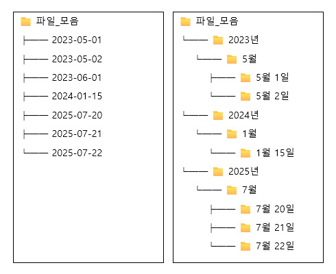 위와 같은 구조를 약간만 변형해 '월-일' 폴더에도 동일한 정리 로직을 적용할 수 있겠죠! 프로그램을 실행하면 폴더들이 자동으로 재배치되어, 정돈된 구조를 즉시 확인할 수 있습니다.