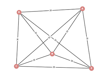'C': {'A': 15, 'B': 35, 'D': 30, 'E': 20},