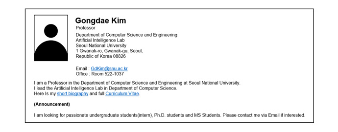 교수님들의 개인 홈페이지는 보통 [그림 1]처럼 디자인되어 있습니다. 이곳에는 소속, 어떤 연구실을 이끄시는지, 경력 사항(Curriculum Vitae)은 어떠한지, 연락처는 무엇인지와 같은 중요한 정보가 게시되어 있습니다.