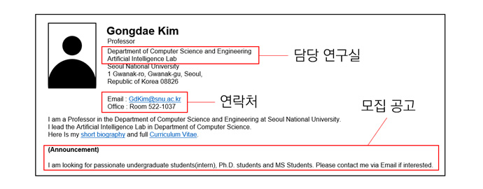 또, 메일과 같은 매체를 이용해서 교수님께 직접 연락을 드려 랩 인턴을 시작할 수 있습니다. 대학 전공별 홈페이지에는 교수님들의 연구 분야, 개인 홈페이지와 같은 정보가 게시되어 있습니다. 이 중 관심 있는 교수님의 개인 홈페이지를 찾아봅시다.