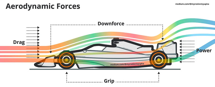 이 힘은 F1 머신이 트랙에 잘 붙어있도록 도와주어 타이어의 접지력을 극대화하고, 엄청난 속도로 코너를 돌 수 있게 해줍니다. (다운포스와 접지력에 대한 더 자세한 내용은 공대상상 46호 '공대생의 눈으로 영화보기: 그란 투리스모2)'편을 참고해주세요!)